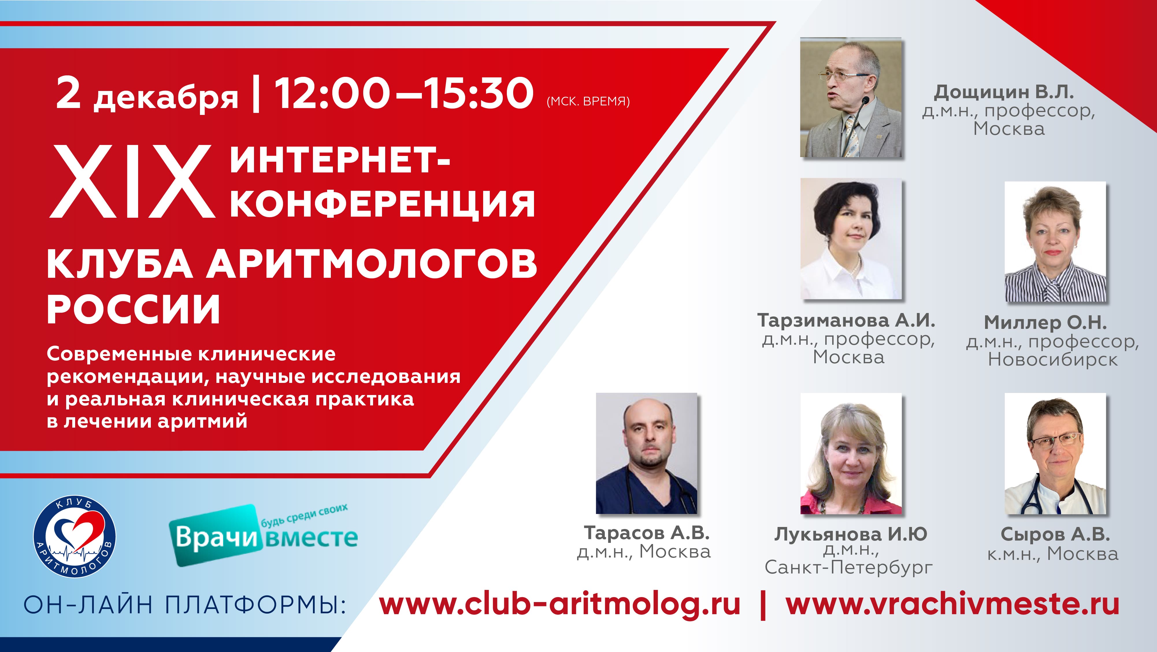 Уважаемые коллеги! Приглашаем Вас принять участие XIX Интернет-конференция Клуба аритмологов России. Современные клинические рекомендации, научные исследования и реальная клиническая практика в лечении аритмий.