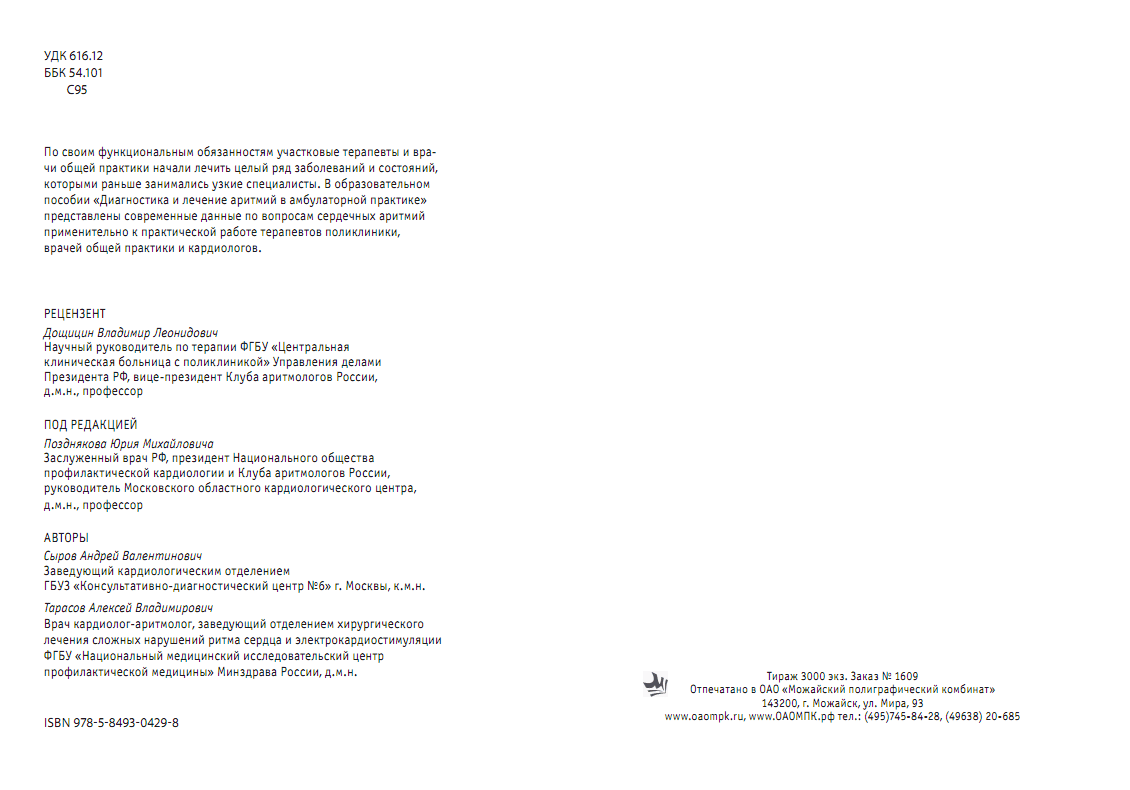 Уважаемые коллеги! В начале 2019 года издано пособие «Диагностика и лечение аритмий в амбулаторной практике»